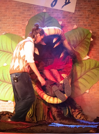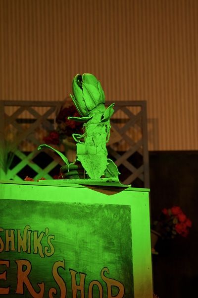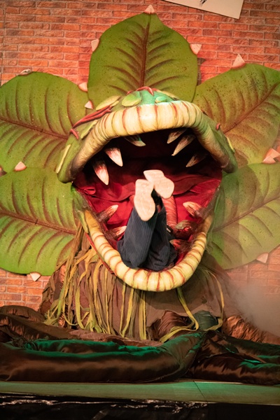 Dreh- und Angelpunkt dieses Musicals ist natürlich die Pflanze und es wurde dem Musical-Team relativ schnell klar, dass wir nicht in der Lage sein würden, die verschiedenen Wachsstumsstadien von „Audrey Zwo“ in irgendeiner Weise neben den Proben im Unterricht bauen zu können. So haben wir uns für unsere Inszenierung „Audrey Zwo“ aus dem Hamburger First Stage Theater ausgeliehen und mit einem Transporter aus Hamburg abgeholt: Eine 10 cm kleine Pflanze, die „etwas Besonderes“ ist und die Seymour einem Chinesen bei einer Sonnenfinsternis abkauft, eine 25 cm große Pflanze im Topf, die unter dem Ladentresen von Hand bespielt wird, eine 40 cm große Handpuppe, die unter einem Fake-Arm von Seymour belebt wird, eine 150 cm große Version, die mithilfe eines sitzenden Puppenspielers bewegt wird und das erste Mal spricht. Ausgewachsen ist die Horrorpflanze 250 cm groß, sie wird mit vollem Körpereinsatz von zwei Schüler:innen zum Leben erweckt.