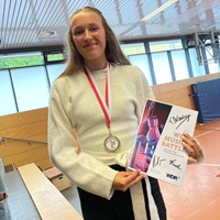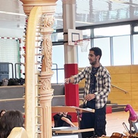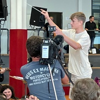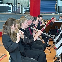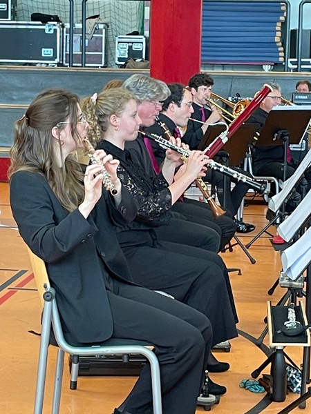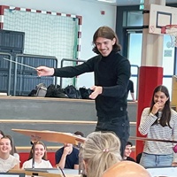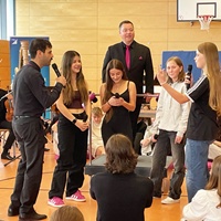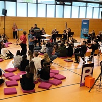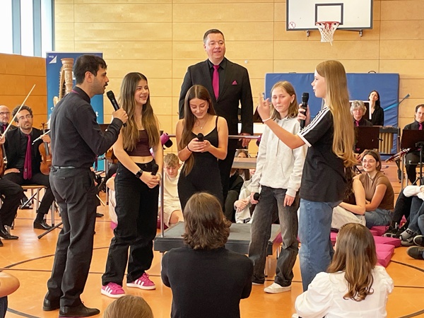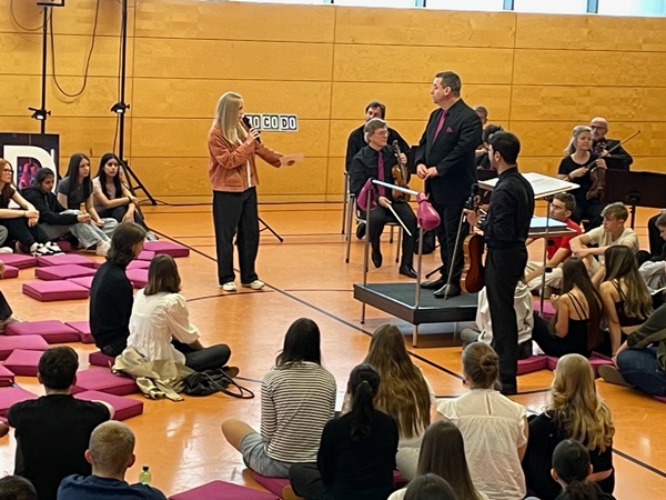 In der darauf folgenden Challenge ging es um Instrumentenkunde: Fragen zu Musikinstrumenten(gruppen), es gab vier mögliche Antworten, nur eine war richtig. Offenbar auch keine wirkliche Herausforderung, denn fast alle Gruppen punkteten hier mit fundiertem musikalischen Wissen. Zu „Gaming-Music“ - vorgetragen vom Orchester - mussten nun Papierflieger in unterschiedlichen Farben gefaltet werden. Wozu? Welcher Flieger aus welcher Gruppe fliegt am weitesten? Nach diesem eher sportlichen Wettkampf stand allerdings immer noch kein Sieger fest, also gab es für alle eine Schätzfrage: wieviele Saiten hat eine Konzertharfe? Anschließend stand die 8d als Sieger des Battles fest und bekam vom Dirigenten eine Urkunde und eine Siegermedaille überreicht.