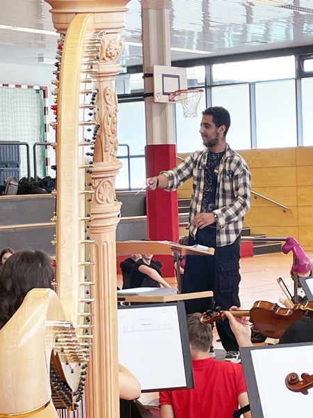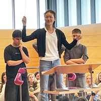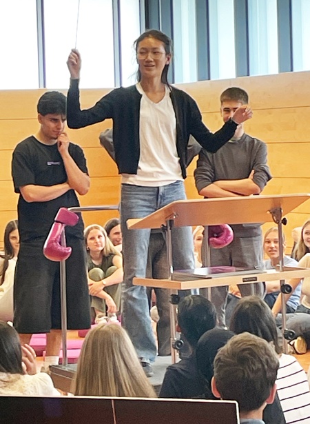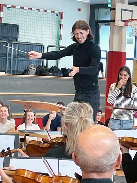 Nun war Mut gefragt! Aus jeder Gruppe hatte ein Freiwilliger bzw. eine Freiwillige die Möglichkeit, sich einmal selbst ans Dirigentenpult zu stellen, um einmal unmittelbar „die Magie eines Orchesters“ auf dem Dirigentenpodium zu erleben. Mittels einfacher Bewegungen mit dem Taktstock (rauf = laut, unter = leise, schnelle Bewegungen hin und her = Tremolo/Zittern) wurden den Neu-Dirigent:innen grobe Handlungsanweisungen gegeben und manch einer war schon überrascht, wie schnell ein Profi-Orchester selbst auf kleinste Impulse eines Dirigenten reagiert.